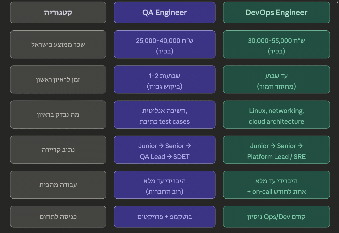 אם אתה בתחילת הקריירה: QA הוא כניסה מצוינת לעולם ההנדסה אם אין לך ניסיון קודם. DevOps הוא צעד טבעי אחרי שצברת בסיס הנדסי.