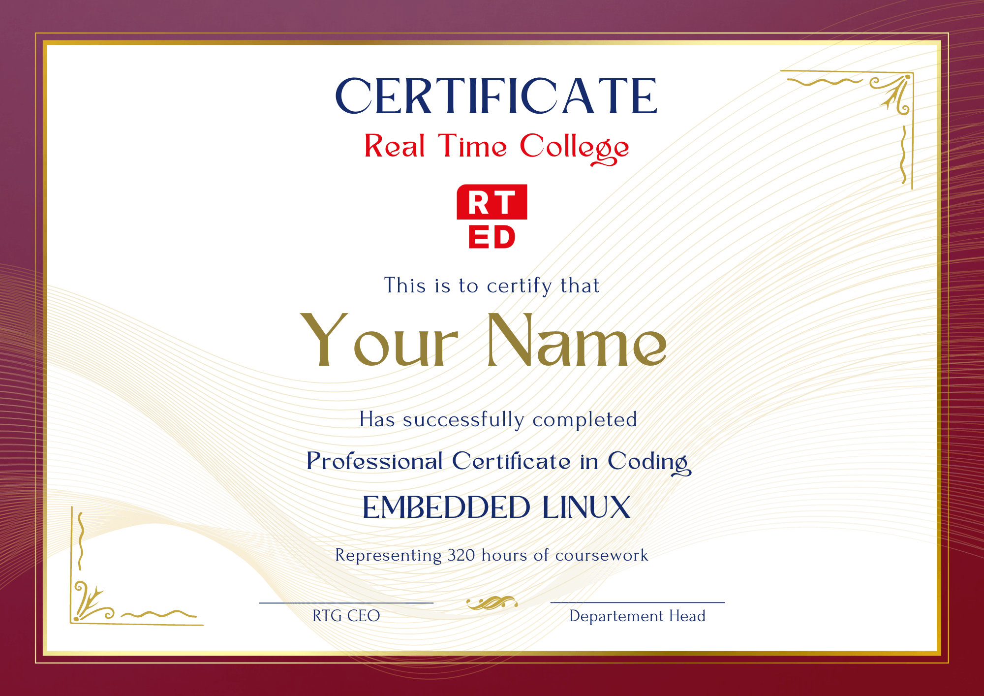 בסיום קורס Real Time Embedded תוענק תעודת גמר מפתח תוכנה Embedded Linux מטעם RTG.
